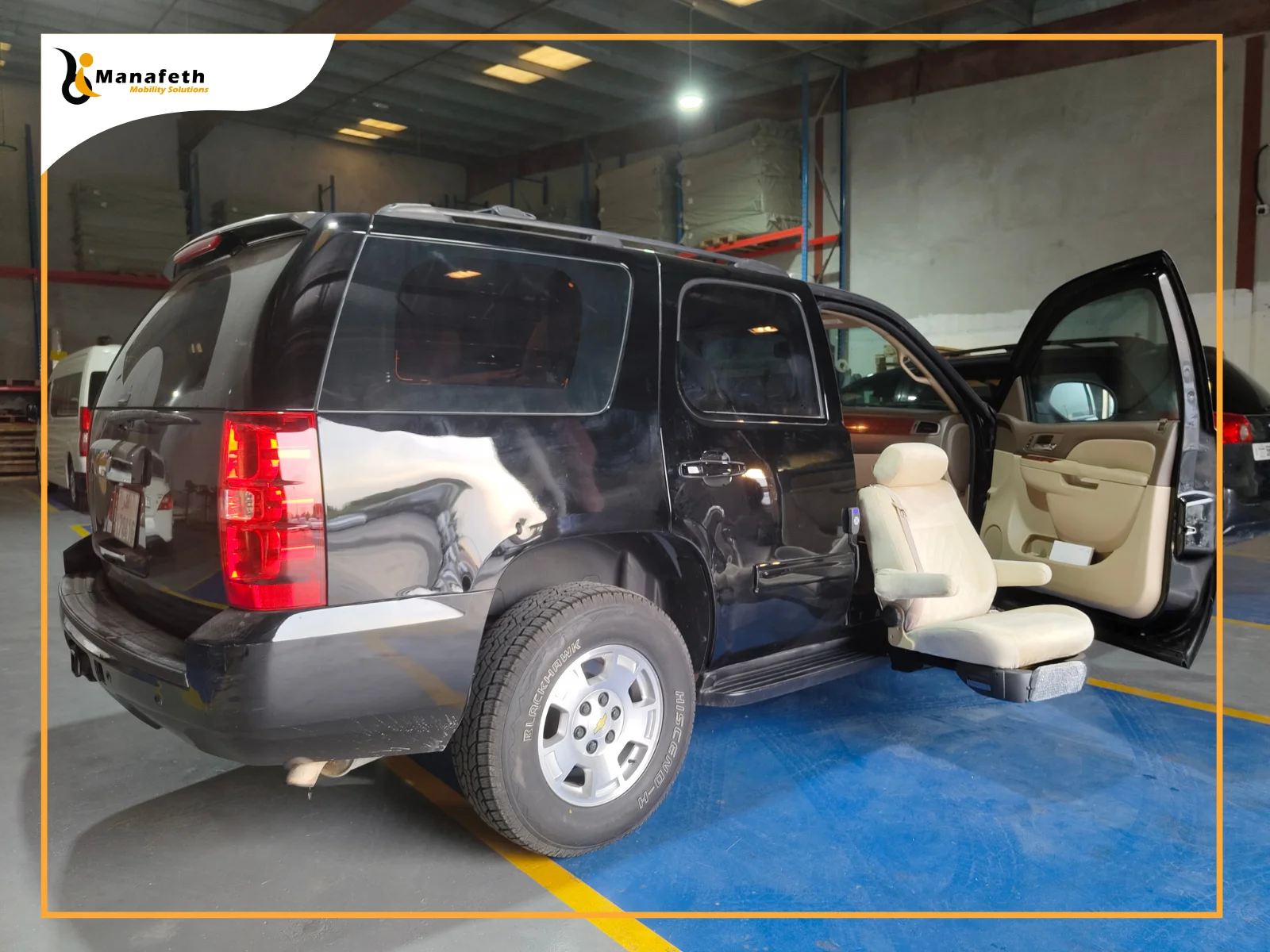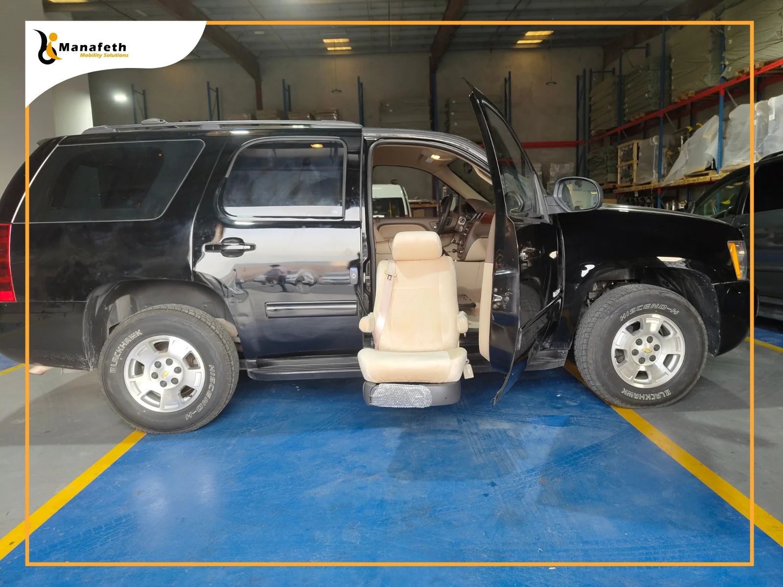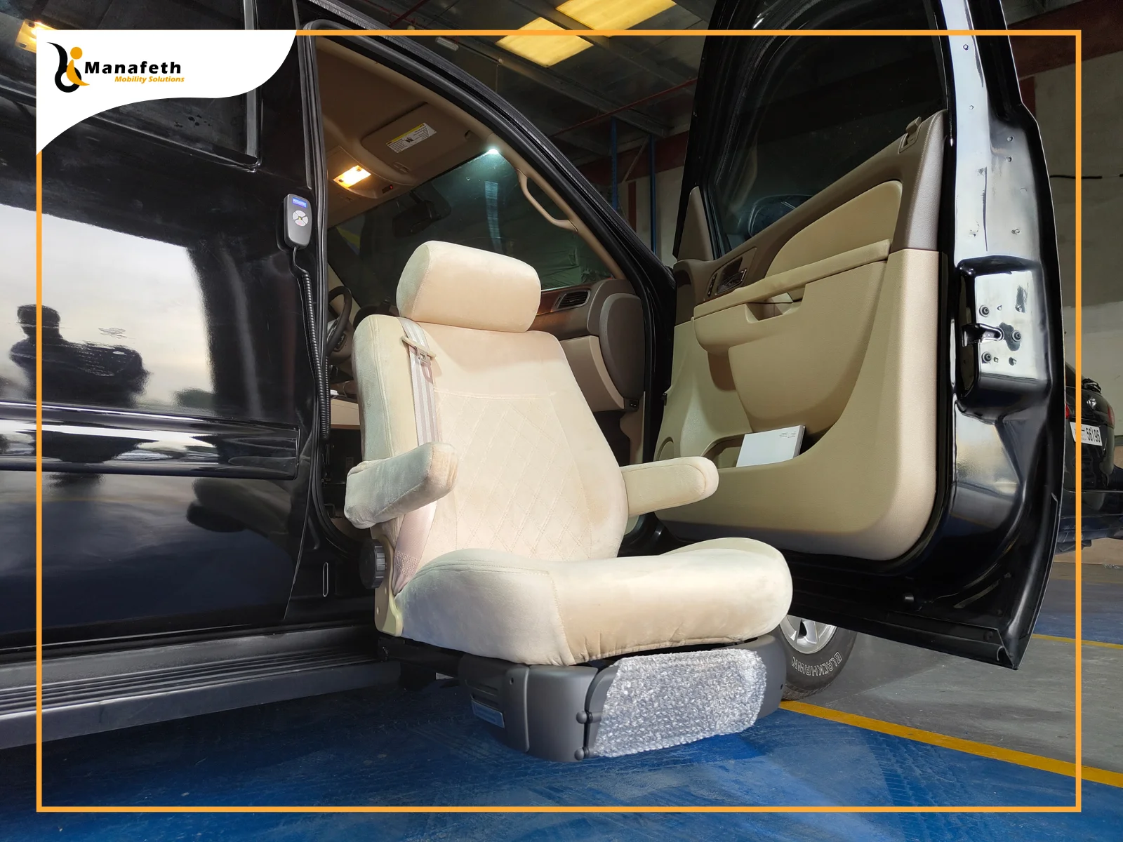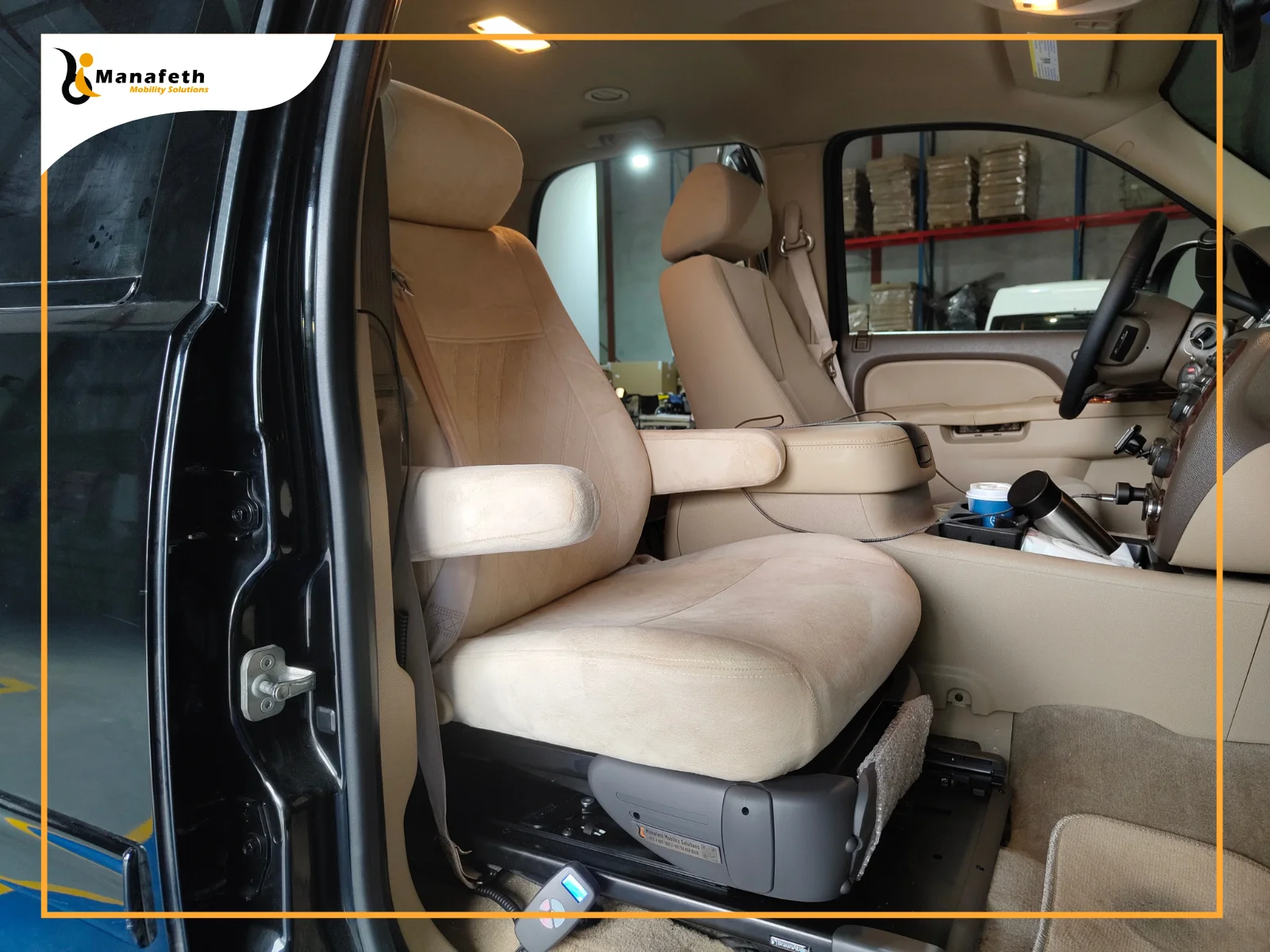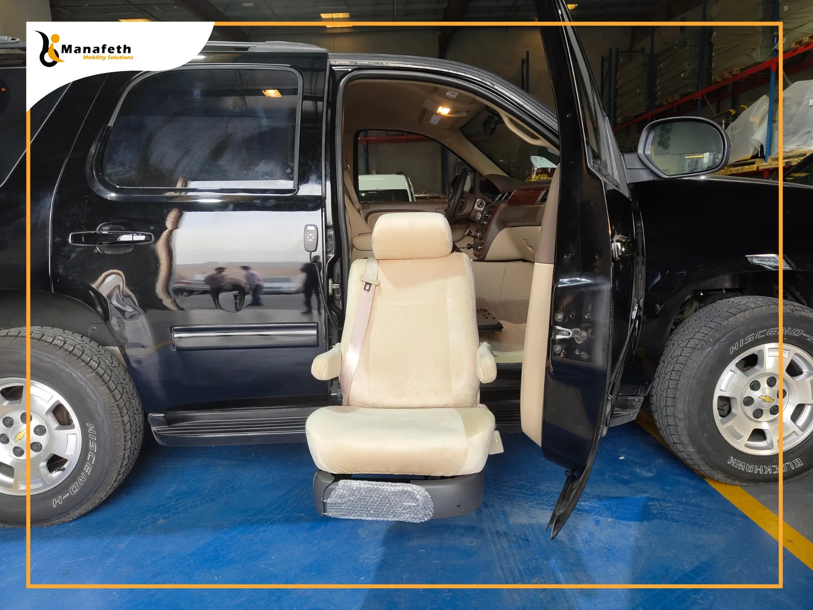 A loving and caring son drove his Chevrolet Tahoe from Qatar to Dubai for the installation of a swivel car seat. He trusted Manafeth Mobility Solutions for their quality services and products, and chose us to modify his vehicle. Our expert team provided a free assessment of his car and recommended the installation of the Turny Evo. The son was intrigued by our analysis and agreed with our recommendation. We installed the swivel seat lift in the Chevrolet Tahoe, replacing the standard passenger seat.
