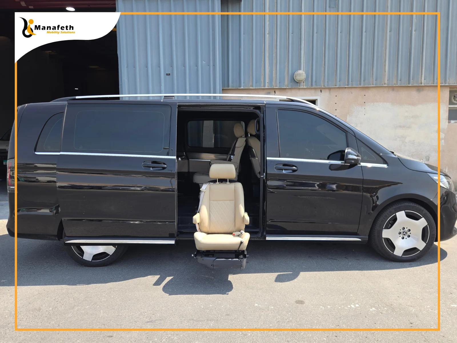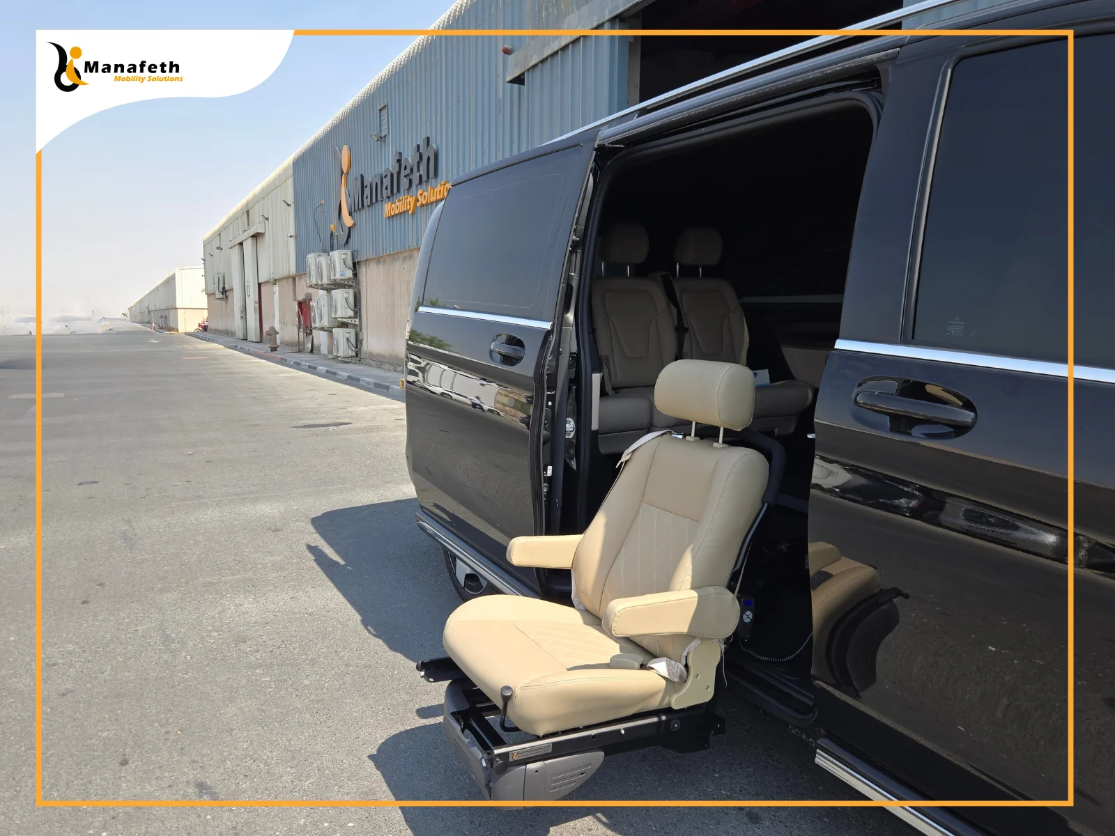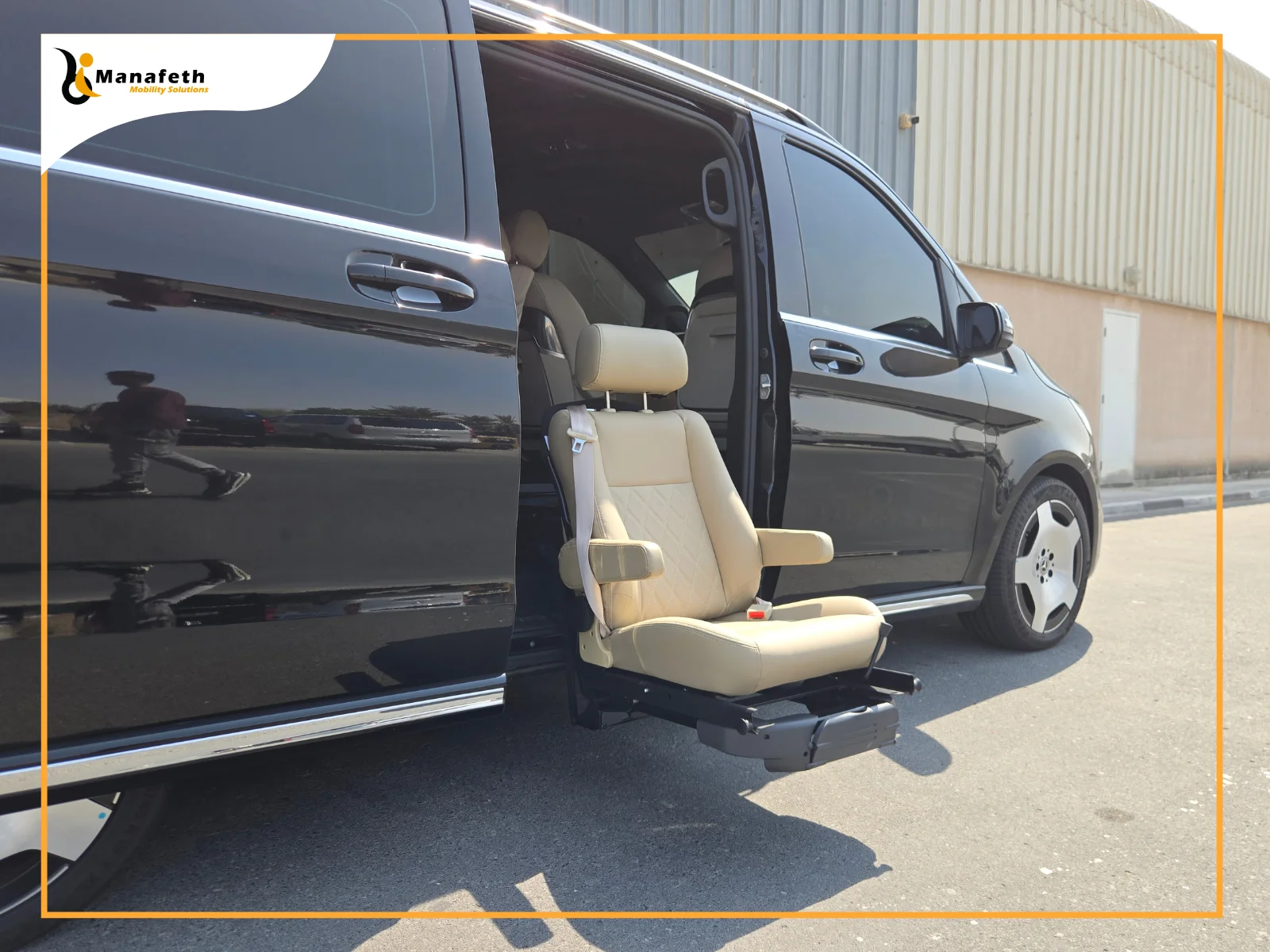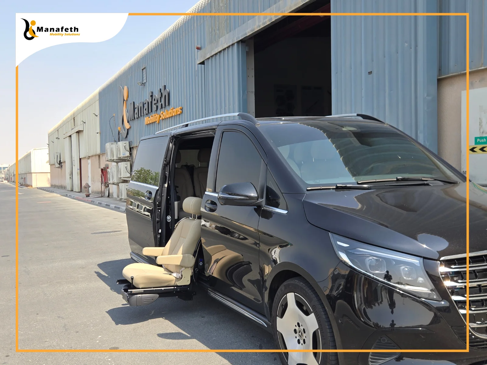 In Dubai, a son was worried about his physically disabled father, who faced difficulty while getting in and out of the Benz V300. This was limiting his father’s independence to travel with the family. He wanted his father to feel included. Therefore, he shared this difficulty with his closest friend, who recommended Manafeth Mobility Solutions. He contacted our supportive team and expressed his concern. He wanted a safe solution to ease the transfer process. Our expert team visited him ASAP and understood his requirements. After a free assessment of his Benz V300, we suggested our Turny Evo. He was relieved with the solution, so we carefully fitted our transfer seat in the middle row of the Benz V300. The whole process of installation took us almost 3-4 hours. With our swivel seat, his father was able to move in and out of the car without any help. Both of them thanked our professional team for the quick and professional installation.