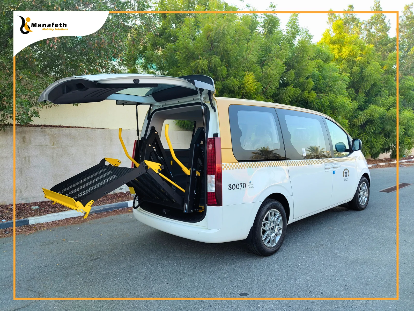 To bridge this gap, Dubai Taxi Company/ RTA decided to take the first step to facilitate people of determination. They recognized the importance of accessibility for wheelchair users. So, they decided to upgrade their vans with advanced vehicle lifts. After exploring several options, they contacted Manafeth Mobility Solutions to be their reliable mobility partner. Our experts installed our high-quality wheelchair lifts in their fleets. With this installation, their taxis become accessible to people with disabilities. Many private companies across Dubai, including Raha Taxi, Al Ghaza Taxi, and many others, also took the same initiative and approached Manafeth Mobility Solutions for accessibility. They wanted every user to feel included, regardless of mobility. So after assessing their taxis, we installed our durable and user-friendly wheelchair lifts in their vehicles, whether it was a car, van, minivan, or SUV. The Wheelchair lifts installed in their taxis enable secure entry and exit. Whether for short trips, outings, or shopping, wheelchair users can move stress-free. This mobility lift provides safe and easy access to vehicles with a handheld remote. Our wheelchair lifts feature a battery backup system, various safety features, and easy-to-use operations.