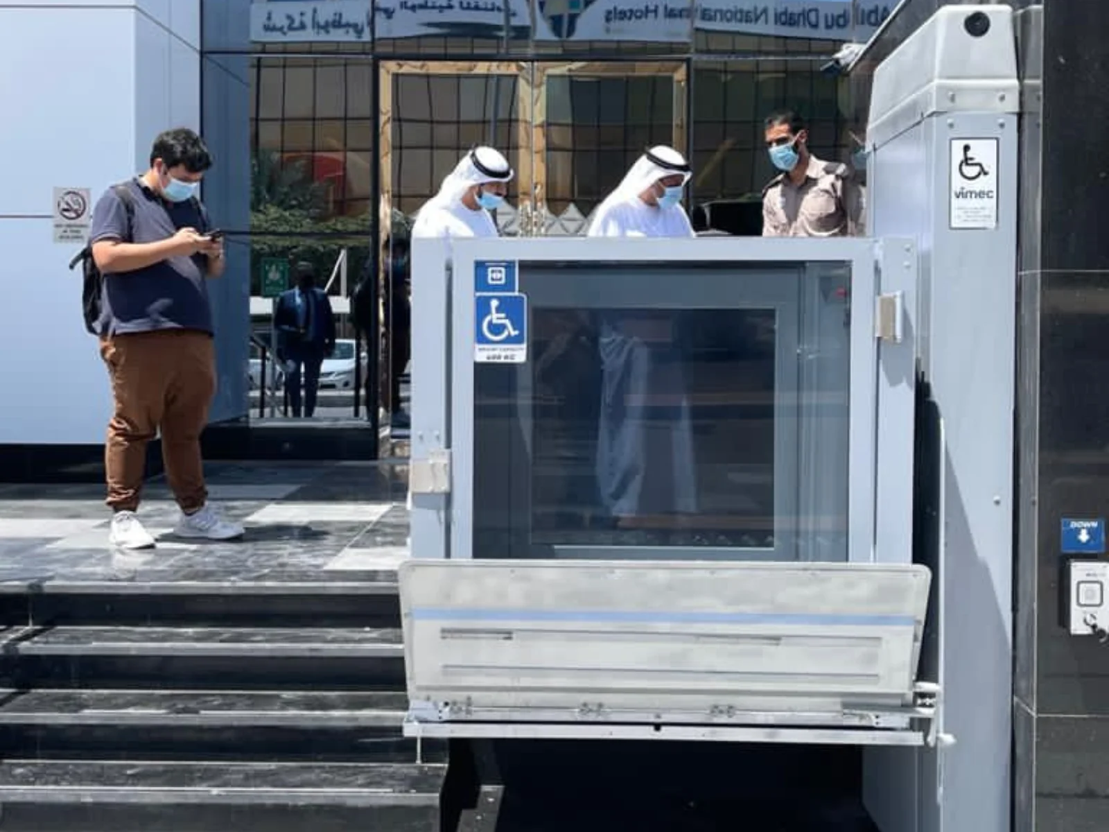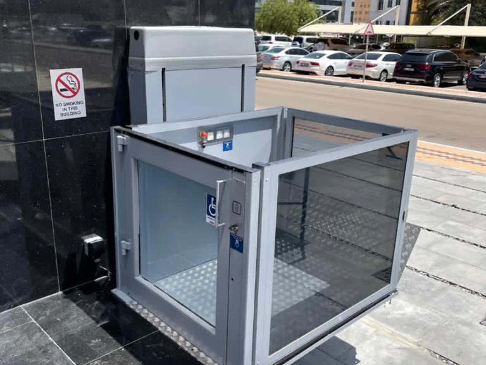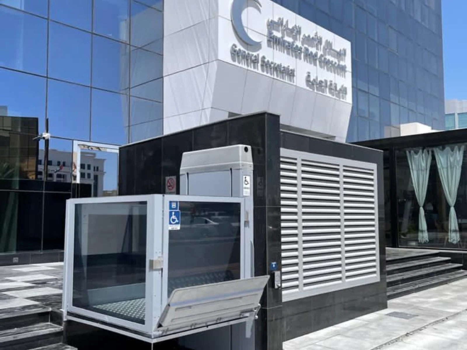The exterior handicap lift installed at Red Crescent Dubai features emergency stop buttons, safety sensors, and an anti-skid platform for enhanced safety.