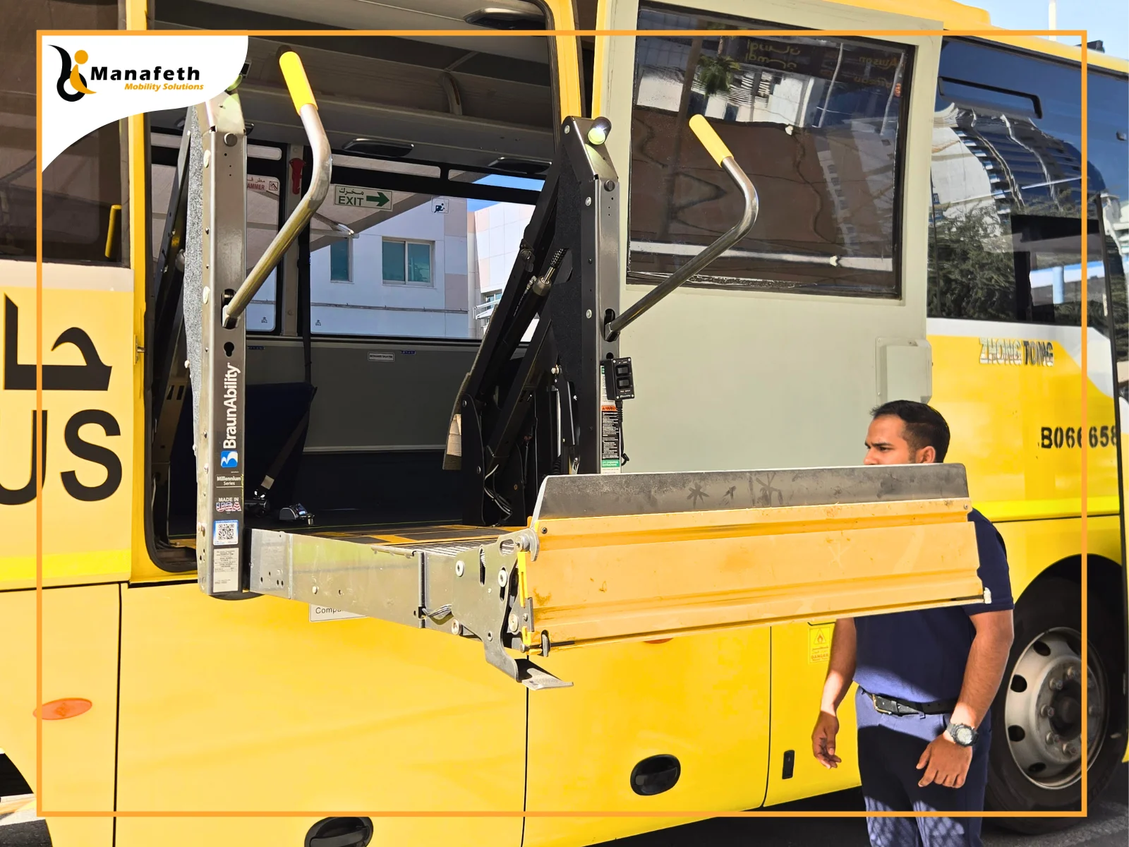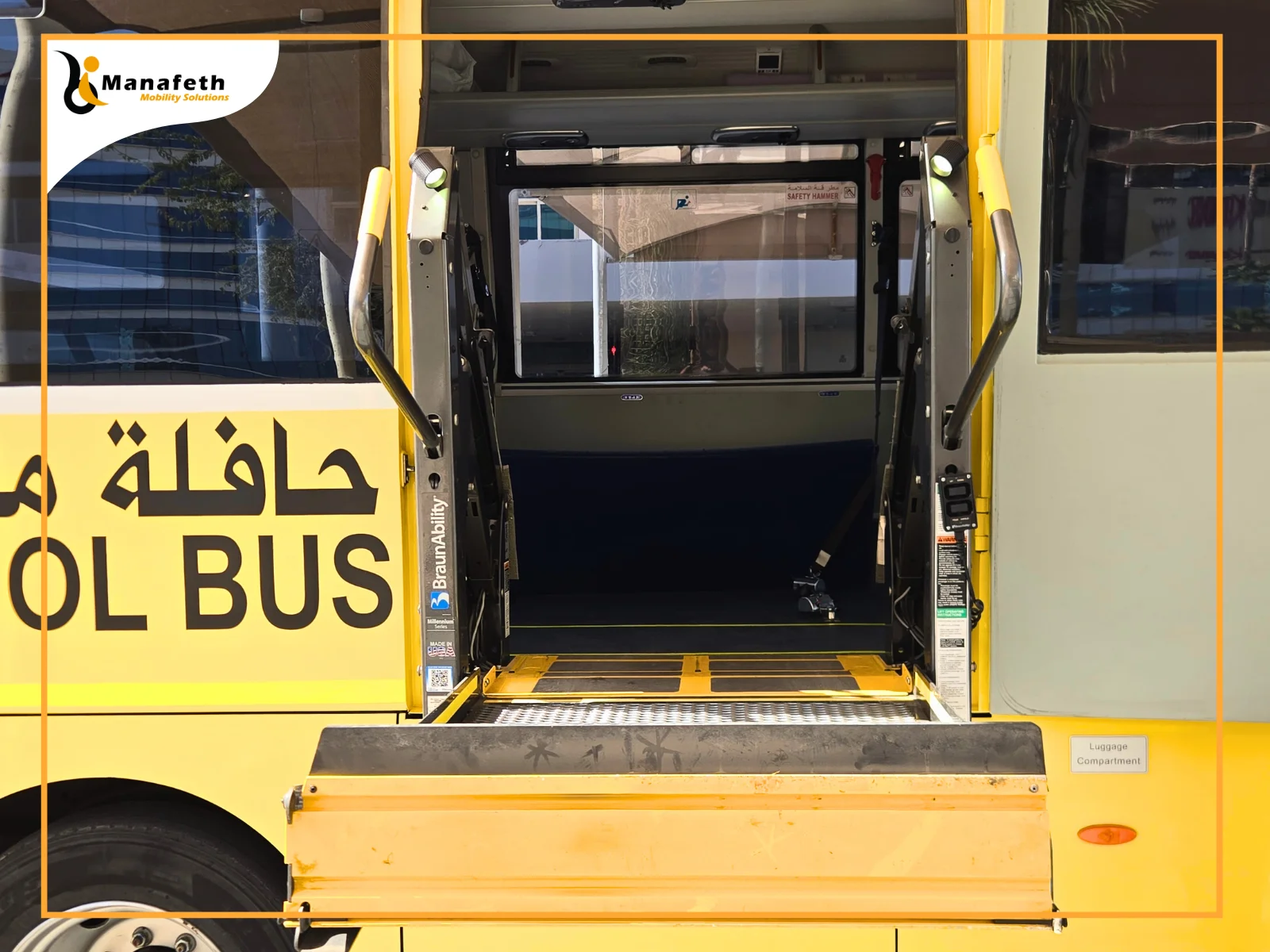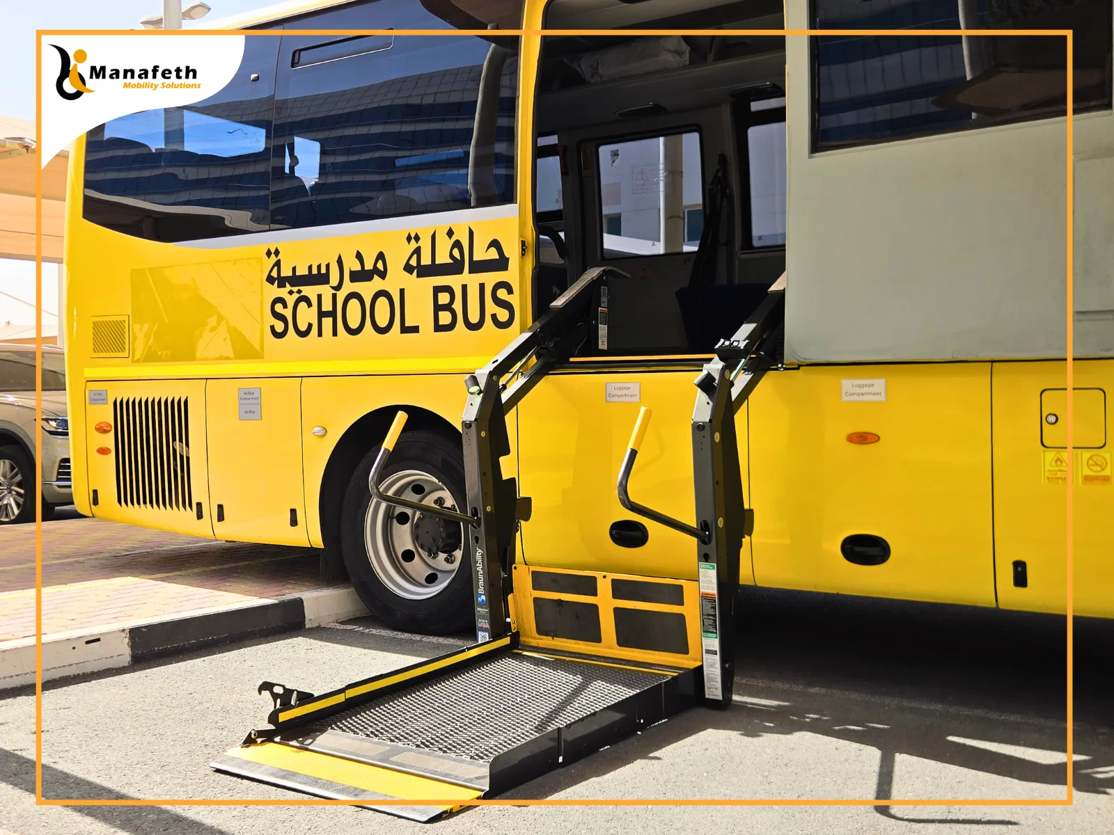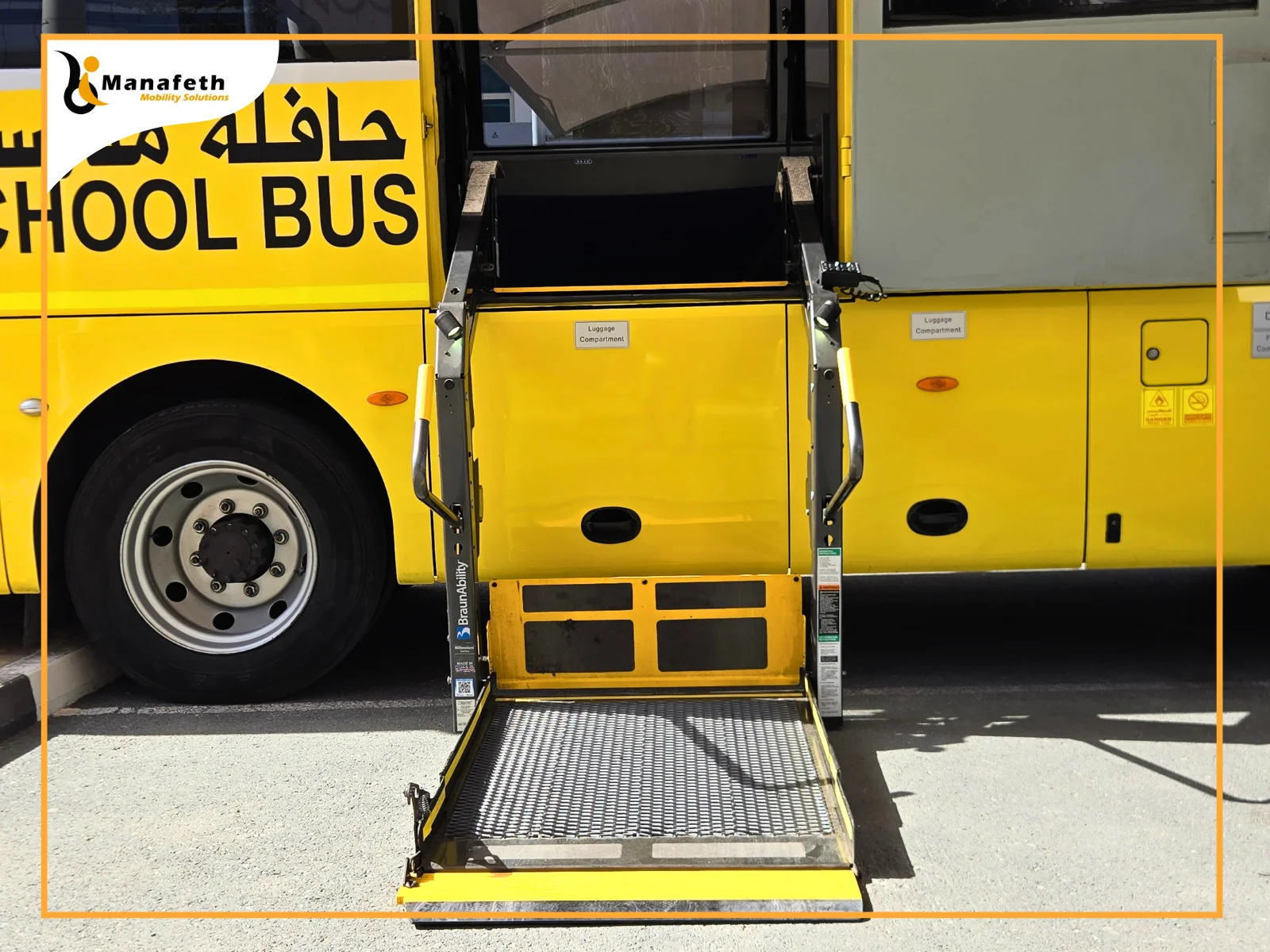 Recently, Manafeth Mobility Solutions installed a reliable Wheelchair lift in a school bus. As a trusted name in Dubai, a school reached out to Manafeth’s expert team. The school management shared their concern that transferring disabled students in and out of the bus is unsafe and time-consuming for both students and staff. The management needed a dependable solution for a safe transfer. The Manafeth professionals listened to them carefully and understood their requirements. Our professional team did a free analysis of the bus and suggested installing a Wheelchair lift. The school management was satisfied with our suggestion. After their approval, Manafeth’s team carefully fitted a BraunAbility Millennium Series wheelchair lift in the school bus to ensure smooth access. With our wheelchair lift installation, disabled students can access the bus from the ground without any physical effort.