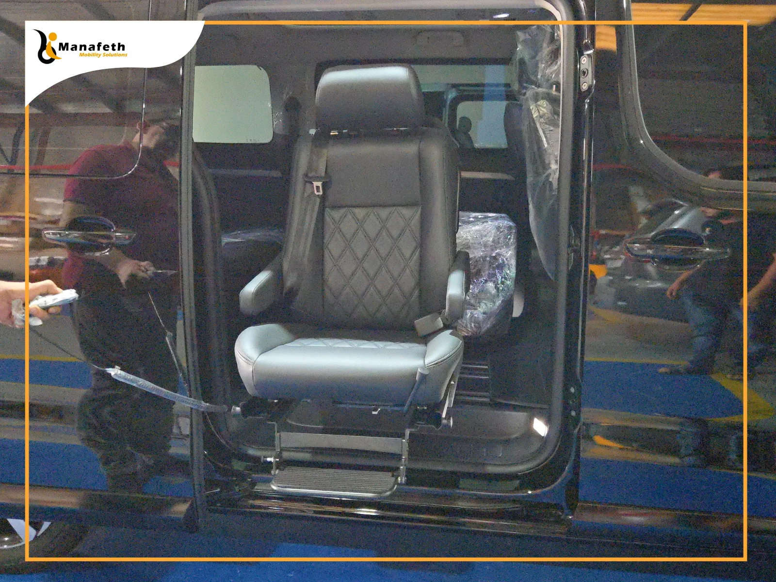 The eldest daughter of a family met with an accident and suffered severe spinal injury. After the accident, she became totally dependent on her family. She feels like a burden while getting in and out of the minivan. Seeing this, her father started looking for a dependable solution. He discussed this issue with his friend, who recommended Manafeth Mobility Solutions. He contacted our supportive team and shared his concern. After listening to him, we visited him as soon as we could. After a free assessment of the Peugeot Traveler, we offered a fully powered swivel seat. We discussed all the features of our transfer seat that make the transfer easy. The family was pleased with the solution. After their approval, we carefully fitted a turny seat in the middle row of the Peugeot Traveller. Their daughter was relieved after using our car seat. Now, she can easily move in and out of the minivan without any assistance.