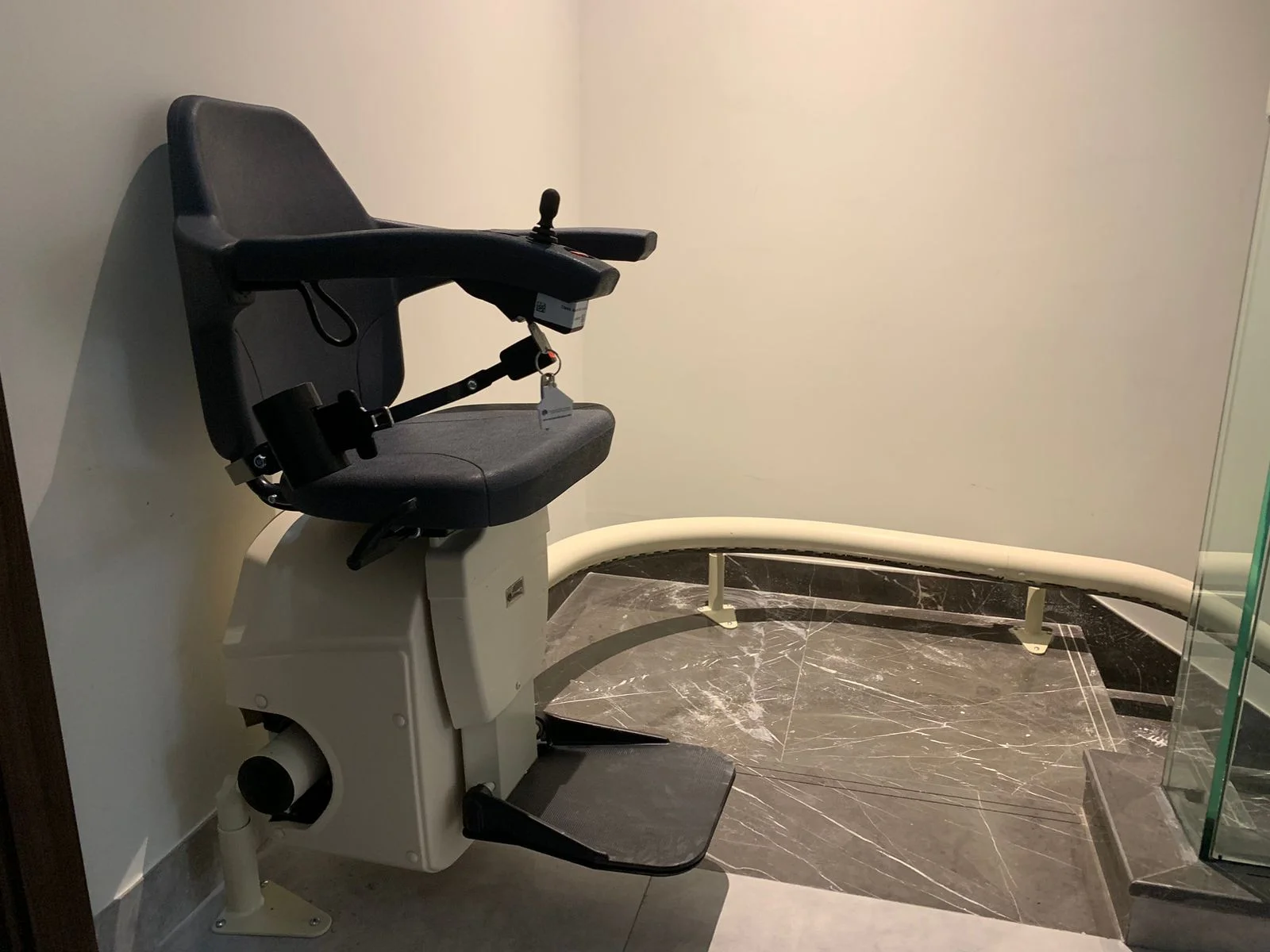 Our curved stairlift for sale features safety sensors, a key-lock system, and built-in seat belts for additional safety.