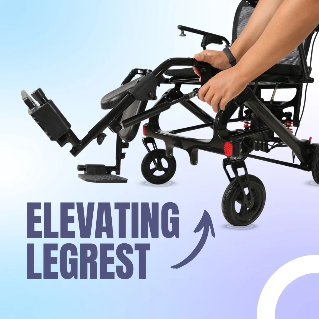 The power wheelchair features an adjustable legrest that can be handled with a hand for proper positioning and to reduce pressure on the user’s body.
